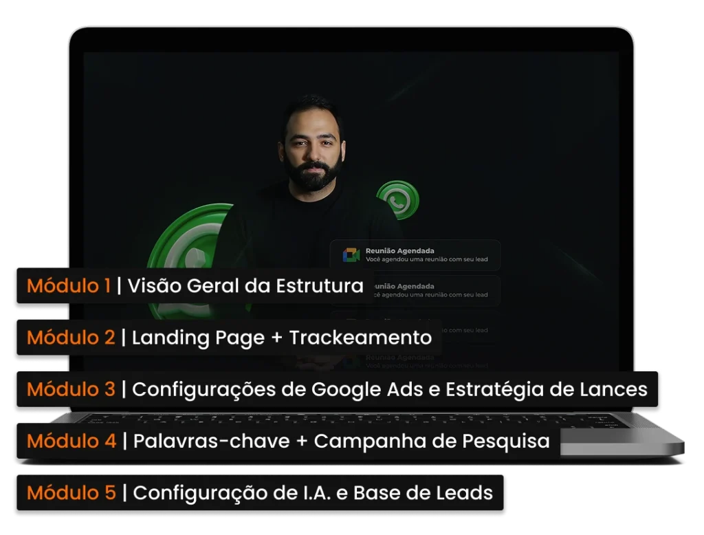 Você vai sair com uma estrutura pronta pra rodar campanhas de aquisição de leads altamente qualificadas — do Google direto pro WhatsApp. Gerando uma base de leads de forma simples.